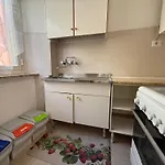 The apartment includes a kitchen featuring a refrigerator and an oven.